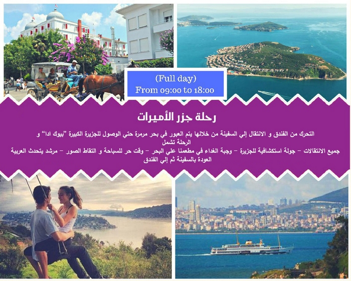 نقدم لكم رحلة جزر الأميرات، وهي سلسلة مكونة من 9 جزر في بحر مرمرة بعيداً عن ضوضاء مدينة اسطنبول. وبعد أن كانت منفى في السابق، أصبحت جزر الأميرات وجهة سياحية شهيرة. وبصرف النظر عن السياح، يلجأ إليها سكان اسطنبول أيضاً لقضاء يوم ممتع بعيداً عن زحمة المدينة. من بين التسع هناك فقط أربع جزر مفتوحين للزوار. سنقوم بزيارة ثلاث منهم آخرهم “بيوك أدا”، وهي أشهر تلك الجزر وأكبرهم. سيتاح لك الوقت للتجول في الجزر واستكشافها، وستفاجأ عند رؤية المحلات التجارية والڤلل الفاخرة هناك.