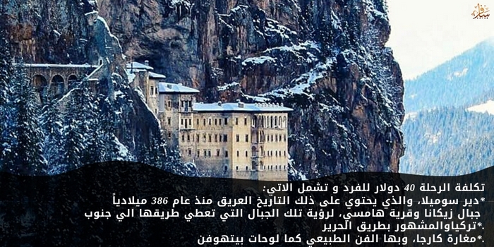 تبعد سوميلا 50 كيلو متر فقط عن طرابزون لكن لا داعي للقلق حيث سنقوم باصطحابك من الفندق ونعيدك الي الفندق مره اخري بعد الانتهاء من رحلتنا في سياراتنا المكيفة فلا داعي للتوتر، فقط تأكد من احضار الكاميرا الخاصة بك لتوثيق لحظاتك الممتعة.